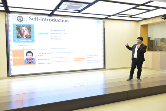 在博士沙龙环节,来自北亚博士班的冯旼博士,为了体现“三双”教师的双语特点,全程采用英语,与大家分享了他的博士项目课题“思维的关键,幼儿早期的执行功能(executive function)”。冯旼博士讲解到,执行功能(executive function) 指的是个体多个认知加工过程协同操作,进行意识控制的心理过程,属于一种重要的高级认知加工过程,是当前国际发展心理学研究中的一个新热点,也是对人的一生发展意义重大的一种能力。他的研究对国内外执行功能的相关研究进行梳理,概要介绍其定义、分类,对执行功能的理论解释进行系统述评,扩展了关于执行功能的科学研究的理论视野,并且,结合了已经完成和正在进行的实证研究结果,以天华双语幼儿园为例,探讨了执行功能对儿童发展的影响及其在幼儿园教育实践中的意义。