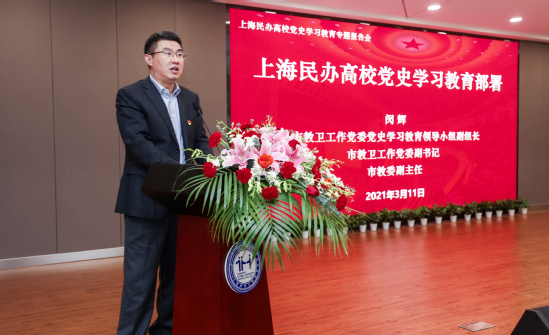3月11日下午,上海民办高校党工委在我校晖华楼报告厅召开党史学习教育报告会,贯彻落实中央、市委和市教卫工作党委关于开展党史学习教育的部署要求,学习贯彻习近平总书记在党史学习教育动员大会上的重要讲话精神、给上海市新四军历史研究会百岁老战士们的重要回信精神。市教卫工作党委副书记、市教委副主任、市民办高校党工委书记闵辉对上海民办高校开展党史学习教育作部署,上海师范大学教授苏智良作《新四军与上海》专题报告。会议由我校党委书记陆建非主持。