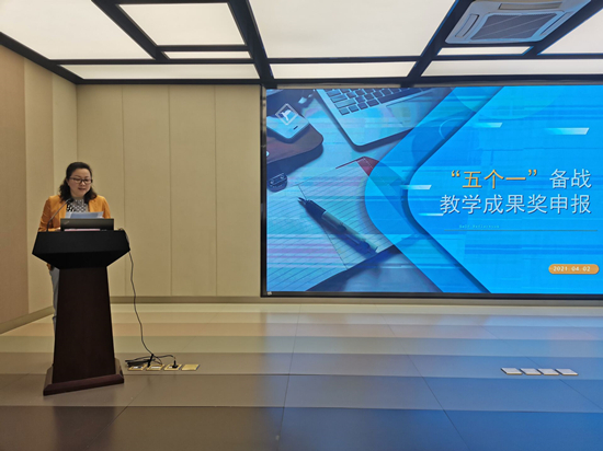 第二项议程,荣获2017年上海市教学成果一等奖的龚春蕾副校长分享申报经验。龚校长首先介绍了“五个一”备战教学成果奖申报经验,然后分享了教学成果奖申报书、成果报告及支撑材料各项内容的内涵、重点、难点,最后展示了获奖申报材料。