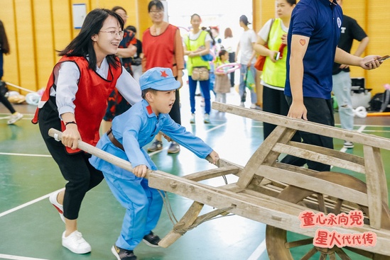 活动围绕“传承红色基因”思想,以闯关游戏、亲子互动等形式为载体,通过军号嘹亮、朱德的扁担、重走长征路、独轮车上的胜利、三军大阅兵五个环节来呈现。