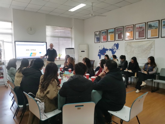 Natan 首先通过轻松、有趣的开场拉近了与北亚利桑那大学博士班教师们的距离。随后,他围绕APA(American Psychological Association)格式展开分享。APA格式是在美国学术界广为接受的一种研究论文撰写格式,特别是应用于社会科学领域的研究。APA格式用于规范学术论文撰写格式和参考文献引用,并规范了表格、图表、注脚和附录的编排方式等等。Natan用详实的例子展示了APA格式对文内引用(In-Text Citations)、参考文献(Reference)等几个方面的要求,以及自己在使用APA格式进行学术写作过程中的心得体会。最后,他分享了与APA写作格式相关的网站供博士班教师们学习和使用。