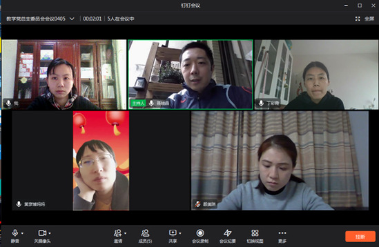 4月6日9:00,学前教育学院党总支召开防疫专题组织生活会扩大会议,采用钉钉线上会议的形式,分为学院中心组、三个学生支部和一个教工支部,共计五个会场。