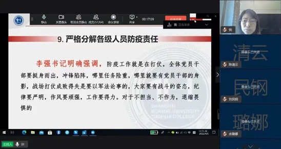 4月5日,党委进行专题部署,要求各级党组织要迅速组织全体党员通过线上方式召开一次专题组织生活会扩大会议,扩大到全体干部和教职工,进一步要求广大干部党员带领全校师生统一思想、提高认识、坚定信心、积极配合、令行禁止、克难攻坚,凝聚起同心战疫的强大合力。学校党委组织部向全体二级党组织紧急下发了《中共上海师范大学天华学院委员会关于召开防疫专题组织生活会扩大会议的通知》,并精心准备了学习材料,要求各二级党组织和全体党支部两天时间完成召开。