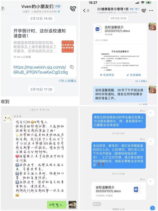 上好“开学第一课”,筑梦美好新学期1111MicrosoftInternetExplorer402DocumentNotSpecified7.8 磅Normal0开学第一课作为学生思想教育的重要环节,学保处根据市教委工作党委、市教委《关于做好教育部“全国高校以‘开学第一课’为重点开展2023年春季学期系列教育引导活动”有关工作的通知》,为进一步深化学生思想政治教育,以提振信心、凝聚人心为目标引领,营造良好开端,利用春季学前开学前后一段时间,以“开学第一课”为重点,精准开展系列教育引导活动,打造后疫情时代高校思想政治工作优良生态。温馨提示共赴前程为确保学生安全顺利返校,学保处高度重视新学期学生返校工作,多次开会研究方案。辅导员通过钉钉、微信平台积极发布返校温馨提示,确保学生平安返校。各职能部门相互配合,多方面完善服务保障。(图片一:辅导员们线上温馨叮嘱)主题班会思政铸魂新春伊始,万象更新。新的学期悄然而至,为了让学生们尽快从寒假的慵懒状态进入到最佳的学习状态,明确新学期任务,养成良好的生活习惯,2月26日下午,各班级开展了以“开学第一课”为主题的班会,以崭新的精神面貌投入新学期的学习生活。(图片二:“开学第一课”主题班会2023-03-01 -