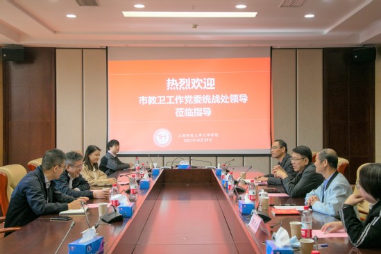 市教卫工作党委统战处领导莅临我校进行统战工作指导10月29日上午,市教卫工作党委统战处长傅欣一行莅临我校进行统战工作指导。校党委书记陆建非,副校长、统战部长陈新斌,党办主任、宣传部长齐砚奎,组织部长周凯波出席本次座谈会。会上,统战部长陈新斌以“做好统战工作,坚守意识形态”为题,对我校统战工作进行汇报。他从“构建大统战工作格局”“认真学习,提高站位”“发挥统战对象作用”“关心少数民族教职工的学生”“落实意识形态工作责任制”等11个方面详细介绍了学校统战工作的基本情况、工作举措及成效,展现了学校党委高度重视统战工作、意识形态工作。另外,学校在积极开展国际交流与合作的同时,也高度重视对外籍教师的管理,确保人才培养的质量。他指出,构建大统战工作格局,要确保社会主义核心价值观进教材、进课堂、进头脑工作有序开展;加强青年思想政治工作,实行师德一票否决制;加强校园文化建设,弘扬主旋律,传播正能量;加强教师管理,在课堂教学中严格把关意识形态;积极关注第二课堂,并成立网络舆情引导小组,定期研究动态。傅欣肯定了学校党委对统战工作、意识形态工作的高度重视,鼓励在此基础上进一步加强党对统战工作、意识形态工作的领导,肯定了学校特色的德育学分制管理体制和对于外2021-11-01 -