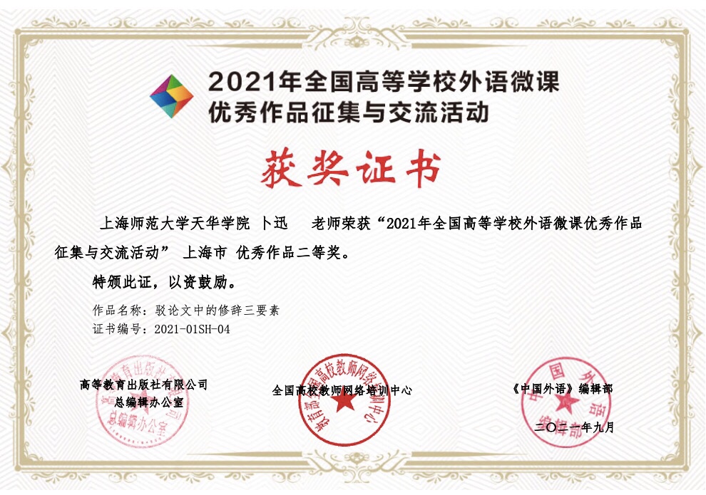 初等教育学院老师获外语微课大赛二等奖由高等教育出版社、全国高校教师网络培训中心与《中国外语》编辑部共同承办的“2021年外语微课优秀作品征集与交流活动”日前落下帷幕,我校初等教育学院卜迅老师的微课作品《驳论文中的修辞三要素》荣获“上海市优秀作品二等奖”。此次比赛共征集到来自全国640所学校的1436件微课作品。高等教育出版社自2015年起,已经连续七年举办全国高等院校外语微课作品大赛,受到广泛关注,为全国外语微课教学提供了交流平台。初等教育学院一直以来坚持“以赛促教”,对教师参赛给予大力支持。参赛教师依托学校“活力课堂”教学改革,精细打磨教学微课,持续改进课程质量,致力打造具有两性一度的英语“金课”。供稿人:初等教育学院2021-11-03 -