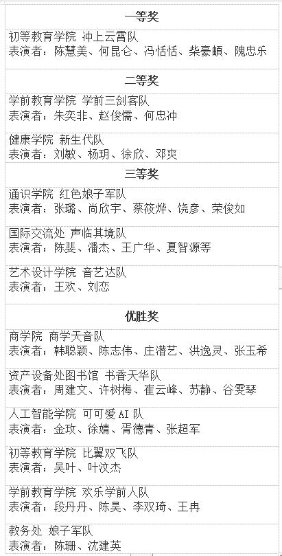 致敬红色经典,礼赞建党百年——学校第四届教职工“爱朗读”影视配音大赛圆满落幕2021年5月28日中午,我校教职工影视配音大赛在图书馆四楼报告厅顺利举行。大赛由学前教育学院教师孙娜主持。副校长、校工会主席吴国兴代表学校工会发表致辞,他表示此次配音大赛是校工会和图书馆联合打造的“爱朗读”品牌活动的延续,在过去的三届爱朗读活动中,学校教职工以“诵读经典”“一封家书”“喝彩祖国”等形式庆祝了改革开放40周年、新中国成立70周年和天华建校15周年等重要历史年份。今年,为庆祝中国共产党百年华诞,深入开展党史学习教育,大赛以“致敬红色经典,礼赞建党百年”为主题,对配音大赛进行创意融合,既为校内广大教职员工提供展现自我的平台,也点燃了全体教职工的红色热情。参加本次大赛的队伍共有12支,不论是近期的爱国大片,还是曾经的红色经典,当一段段影片被参赛选手们精彩演绎时,现场掌声此起彼伏气氛热烈。随后,由副校长陈新斌,初等教育学院院长史文,语言文化学院院长陈再阳,工会常务副主席曹卫组成的特邀嘉宾队,为现场的观众们奉上《七尺之躯,已许国,再难许卿》,收获了台下观众的热烈掌声。经过现场评委组评审最后决出了名次,在座的领导嘉宾为获奖队伍颁发荣誉证书和奖杯。具体获奖名单如下:学校工会通过举办红2021-05-31 -