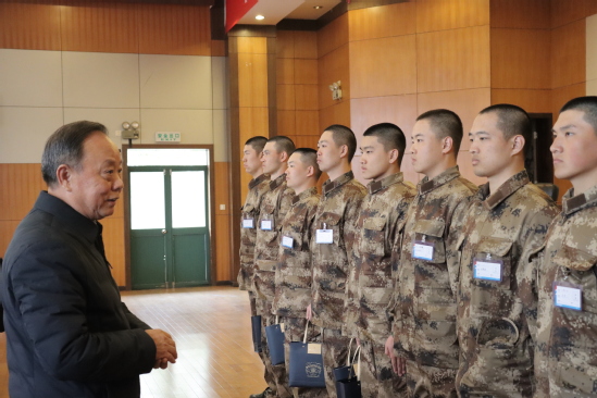 校领导慰问役前参训新兵我校征兵工作在学校党委的坚强领导下,各部门、二级学院的共同努力下,圆满完成了2021年上半年的征集任务,12名同学体检、政审双合格,全部参加区武装部组织的役前集训。3月17日上午,在校党委副书记、学保处处长、武装部部长曹云林的带领下,各二级学院党总支书记等一行13人赴嘉定区新兵役前训练基地慰问我校2021年上半年役前参训新兵。(图一)校党委副书记、学保处处长、武装部部长曹云林向今年应征入伍的同学表示热烈祝贺,深情地叮嘱他们安心服役建功军营,并对应征入伍的新兵提出了四点要求:一是要在思想上适应从校园到军营的转变,倍加珍惜身上的“国防绿”。自觉加强政治理论学习,做一名听党指挥、政治合格的革命军人。二是要展示好大学生的形象,号召全体新兵,牢记“为做人而学习”的校训,努力成为一名有灵魂、有本事、有血性、有品德的新一代革命军人,为校增添光彩。三是要继承发扬革命军队优良传统,树立起新一代革命军人好榜样,自觉做到服从命令、听从指挥、主动学习、团结同志,维护军队形象,展示新一代革命军人的风采。四是要发扬吃苦精神,争当爱军精武标兵。时刻牢记习近平总书记提出的“建设一支听党指挥、能打胜仗、作风优良的人民军2021-03-23 -