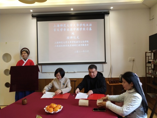 学校语言文化学院与上海浦东致君诵读汇读书服务社签署合作协议并举行授牌仪式3月19日,我校语言文化学院院长陈再阳和上海浦东新区致君诵读汇读书服务社理事长殷雷签订了《关于上海师范大学天华学院语言文化学院在上海浦东新区致君诵读汇读书服务社设立汉语言文学专业国学教学实习基地的协议》,并举行了授牌仪式。我校语言文化学院直属党支部书记郭阿诺及上海浦东新区致君诵读汇读书服务社全体教职工出席。签约仪式我校汉语言文学专业以国学和师范为特色,除了开展培养计划中的日常课堂教学、第二课堂教学和活动外,还构建了严密的实践教学体系,以提高学生的专业应用能力。上海浦东新区致君诵读汇读书服务社致力于普及国学教育,在书院、航头、康桥镇等地设立了“读国文、习国艺”研习基地。2008年起,服务社还与中小学及幼儿园开展传统文化项目合作,通过国学夏令营、国学公益课等形式,把传统文化教学课程送到校园。幼儿国学课一方有国学教育的师资力量,一方有传播国学的途经,3月19日双方签署了合作协议,携手成立国学教学实习基地,后续将以实习基地为平台,开展多层次合作。浦东电视台和《浦东时报》对授牌仪式进行了报道。合影留念 我校语言文化学院院长陈再阳告诉记者,实习基地建立后,学生能够到现场将所学知识进行实践转化,提2021-03-23 -