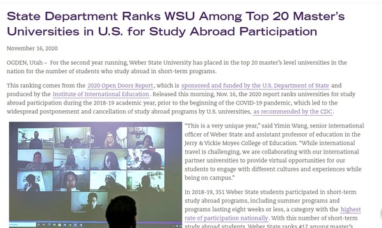 美国韦伯州立大学官方报道与我校合作举办教育学硕士项目近日,美国韦伯州立大学在学校官方网站上报道关于研究生的培养项目,其中着重提及与我校合作的教育学硕士项目。报道中称,尽管受疫情影响,该项目学生不能如期至美国留学,但通过两校的积极协作,双方及时调整项目进程和授课模式,以保证项目的正常进行,确保学生能在规定时间内完成硕士项目,取得相应学位。如今,越来越多的学生选择出国留学,出国留学不仅仅可以使学生们在学习上得到更高的发展,为以后的事业发展打下基础,还是一个开拓眼界增长见识的好机会。我校学生也通过参加此次教育学硕士项目感触良多,其中一位学生受邀接受了该报道的采访,在采访中他讲到:“To me, the Weber State University master’s program is a new chance to change my life and choose my new career,”(对我而言,参加此次韦伯州立大学的项目,为我改变自我及职业选择提供了一次良好的契机)。由此可见,此次的硕士项目为他毕业后的职业道路规划提供了充足的知识储备,是一次十分难得的经历。(韦伯州立大学官方报道硕士项目及我校学生远程授课的情况)(韦伯州立大学2020-12-14 -