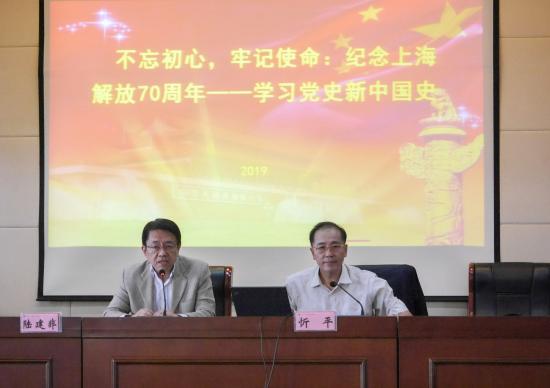 我校举行主题教育“党史、新中国史”专题报告会10月22日,我校开展“不忘初心,牢记使命”主题教育专题讲座,邀请上海市中共党史学会会长,上海大学原党委副书记、博士生导师忻平教授作题为《不忘初心,牢记使命:纪念上海解放70周年——学习党史、新中国史》的报告。校党委委员、校务委员会领导、二级学院党总支书记、支部书记以及部分党员干部、党员师生代表等参加讲座。讲座由党委书记陆建非主持。忻平教授从当下为什么要学习党史、新中国史;解放:一个国际化大都市上海的新生;有条不紊接管上海等几个方面为大家详细讲述了学习党史、新中国史的必要性、重要性以及“两史”的深刻内涵,2019-10-23 -