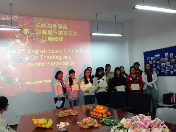 海外学院举行第二届感恩节英文征文比赛颁奖典礼11月27日星期四是西方传统的感恩节,海外学院第二届感恩节英文征文比赛颁奖典礼在天华楼402举行。此2014-12-01