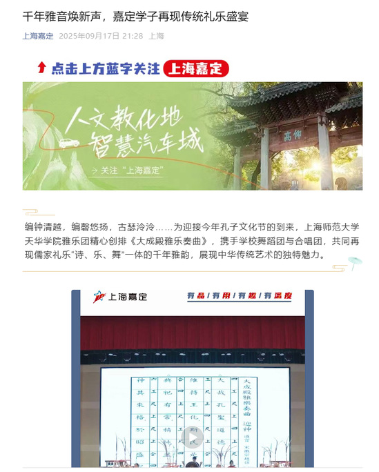 上海嘉定 | 千年雅音焕新声,嘉定学子再现传统礼乐盛宴来源:上海嘉定 2025年9月17日标题:千年雅音焕新声,嘉定学子再现传统礼乐盛宴编辑:彭晓妍编钟清越,编磬悠扬,古瑟泠泠……为迎接今年孔子文化节的到来,上海师范大学天华学院雅乐团精心创排《大成殿雅乐奏曲》,携手学校舞蹈团与合唱团,共同再现儒家礼乐“诗、乐、舞”一体的千年雅韵,展现中华传统艺术的独特魅力。古瑟典雅,竹篪幽深,虎坐鸟架鼓气势恢宏。今天(9月17日),记者走进上海师范大学天华学院雅乐团的排练房,仿佛步入时空隧道,一场穿越千年的雅乐之旅在这里上演。同学们在老师的指导下,认真排练源自《魏氏乐谱》《碎金词谱》《风雅十二诗》等历代古谱的曲目,指尖流淌的每一个音符仿佛都在唤醒沉睡的历史记忆。弹奏瑟的王欣甜告诉记者,自己与这件古老乐器有着特殊的缘分。拥有十几年古筝功底的她,第一次接触瑟就被其深邃的音色所吸引。“古筝通常有21根弦,而瑟有25根,音域更广,弹奏起来也更有难度。”王欣甜表示,虽然古筝和瑟的弹奏手法相似,但要从熟悉的简谱转换到古老的工尺谱,对她来说是个不小的挑战。“为更好地识谱,还原当时的乐器古韵,我们跟着老师一遍遍对照古谱。最后终于能看着古谱演奏出当时的乐曲时,这种感觉特别2025-09-18