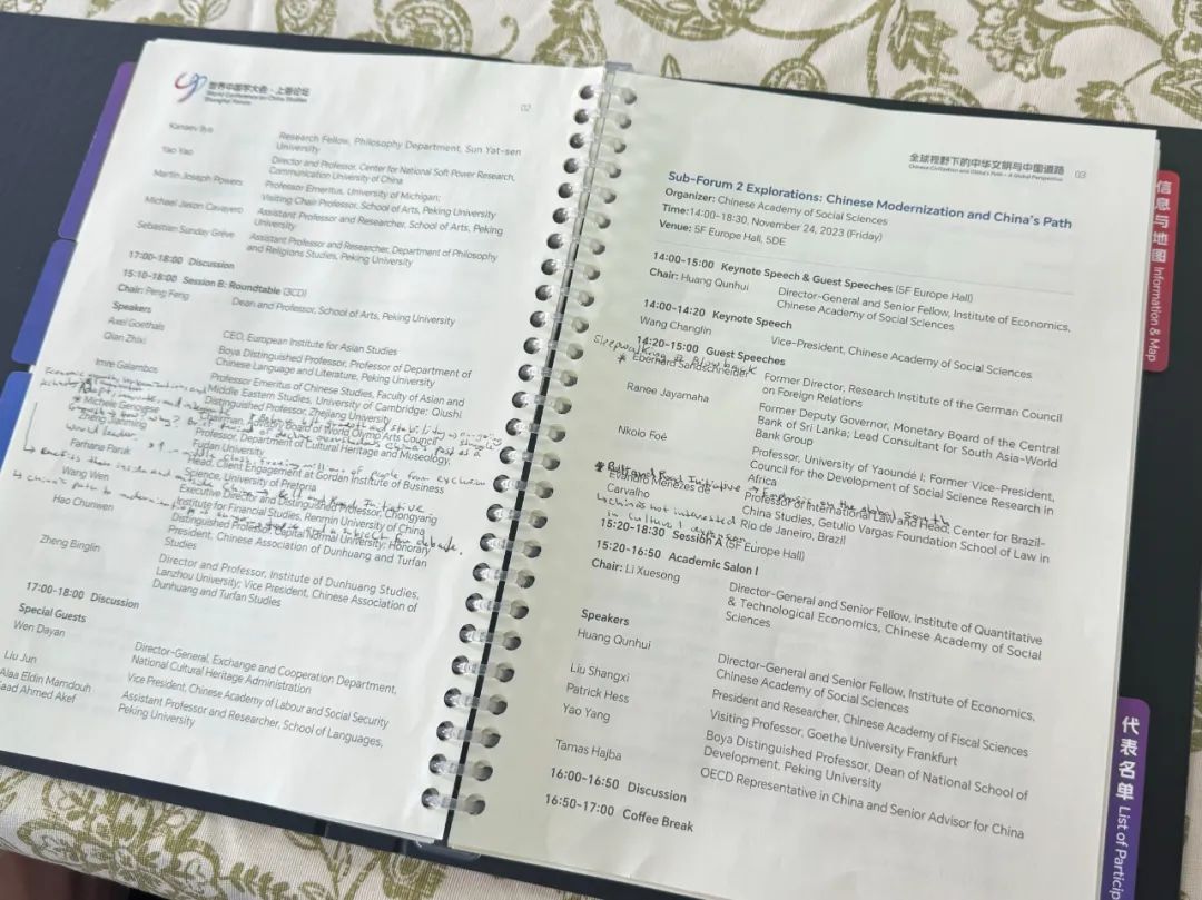 “150多个国家、30多个国际组织签署共建‘一带一路’合作文件,中国如何把‘朋友圈’越做越大?中国式现代化的途径和模式是什么?”来自各国的专家学者,就“全球视野下的中华文明与中国道路”这一主题开展交流讨论,不论国家、语言,与会人员尽情抒发着自己对“中国式现代化”“中国文学”“中国历史”的观点,交流学术成果。
