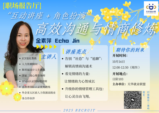 职场报告厅|高效沟通与情商修炼ICF进化教练:金素萍人力资源顾问国家二级心理咨询师IPMA认证国际培训师盖洛普国际认证优势教练外企亚太区前人力资源高级业务合作伙伴斯坦福设计人生教练带你:1.告别“社恐”与“尬聊”:解锁高情商沟通术;2.看见情绪的力量:让情绪助力心智成长;3.升华你的情绪管理工具包:让心灵自由飞翔。时间:2025年10月16日12:00-12:50地点:日阶103教室主办单位:天华就业联盟