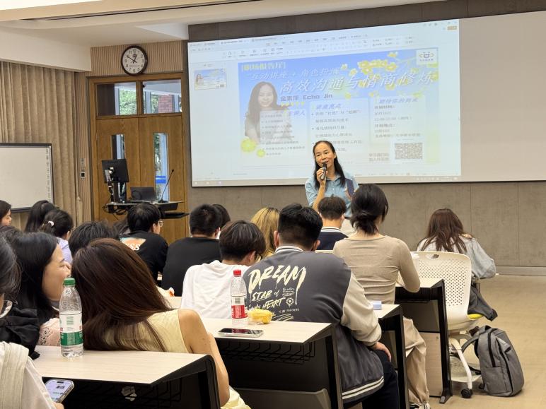 (金素萍老师在给同学们分享高效沟通与情商修炼的方法)