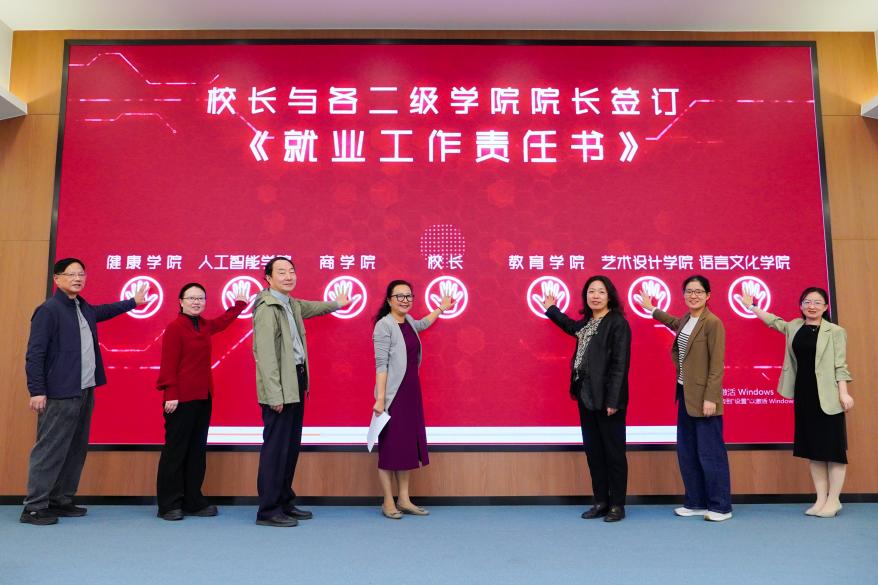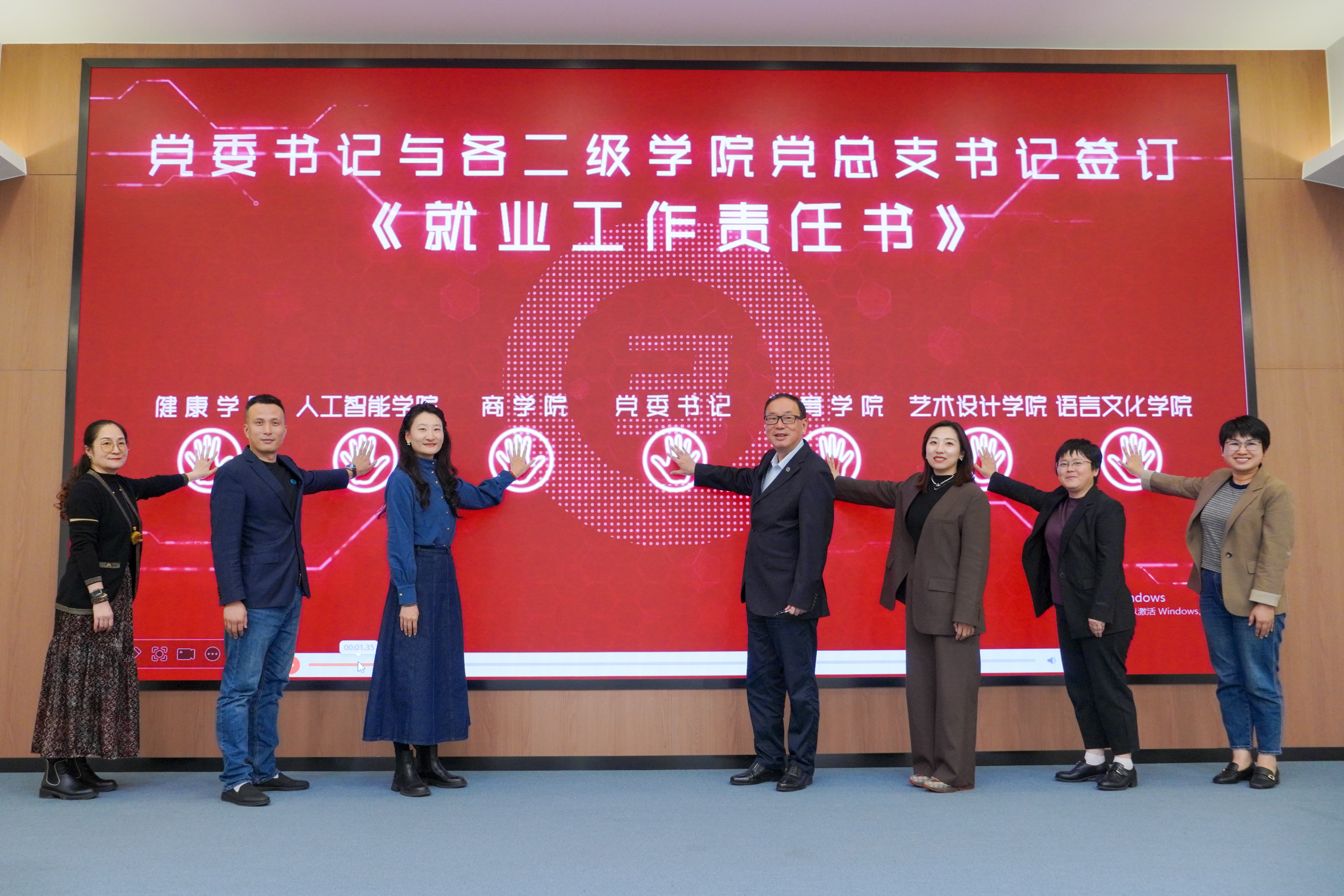 在就业工作责任落实环节,党委书记高建华、校长龚春蕾与各二级学院党总支书记、院长现场“按屏签订”《就业工作责任书》,进一步明确了目标任务与职责分工,强化二级学院就业工作的主体责任,推动形成上下联动、齐抓共管的工作格局。