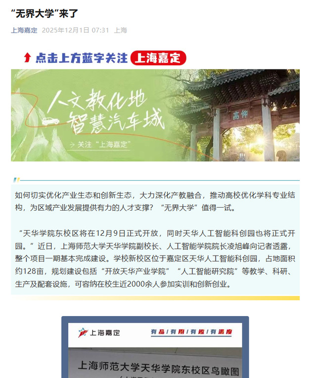 据介绍,校方已联合嘉定工业区,探索校地合作的创新联合体。新校区及产业园将重点打造AI与机器人产业集聚高地,成为嘉定北部特色产业节点;探索“校中厂、厂中校、项目即课程”等新模式,形成可推广的应用型本科范式;依托学院资源,培养工程师与技师型人才,成为嘉定工业区及周边园区的技术服务中心与创新资源平台。