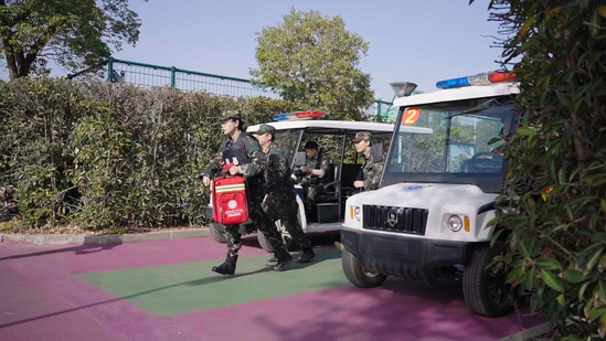在处置突发事件的同时,医疗救护组携带急救箱同步介入救援。医护人员迅速对 “伤员” 进行生命体征评估,熟练开展止血包扎、心肺复苏等急救操作,并使用应急标识清晰标记伤情等级。待模拟急救车抵达后,校医详细向专业医护人员交接受伤经过、现场处置措施及伤员实时生命体征数据,协助完成伤员转运工作,两名保卫干事随车护送,构建起 “学校初级急救 – 医院深度救治” 无缝衔接的生命通道。