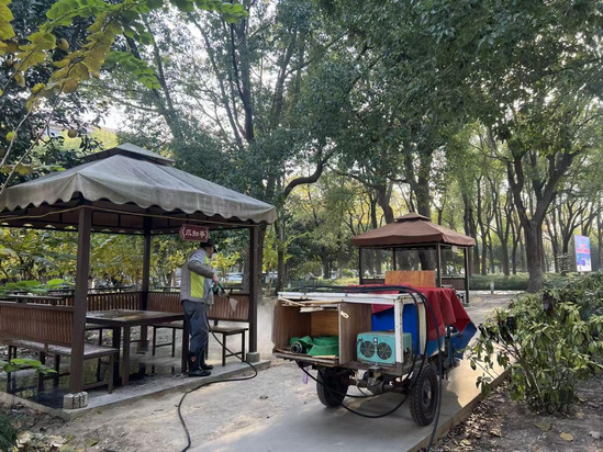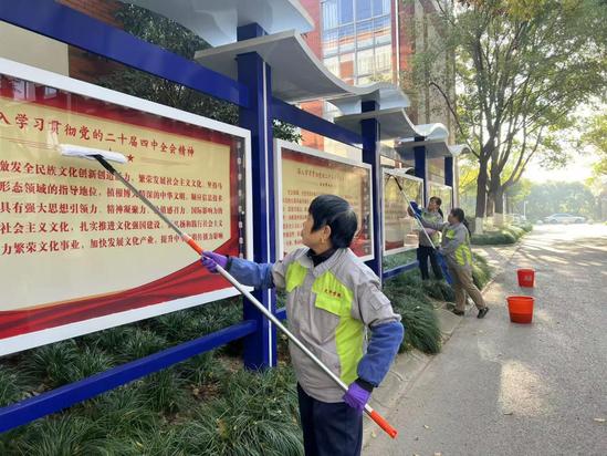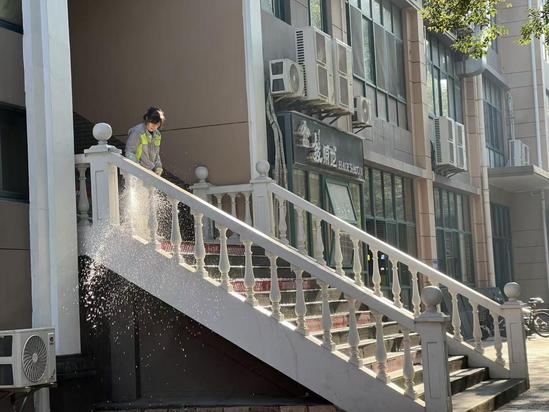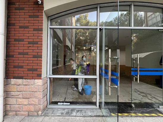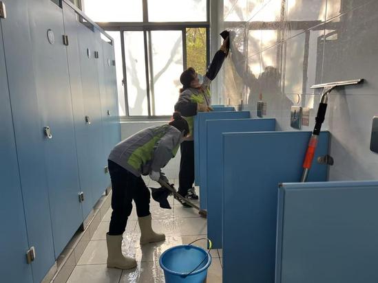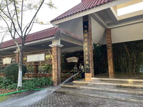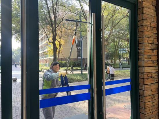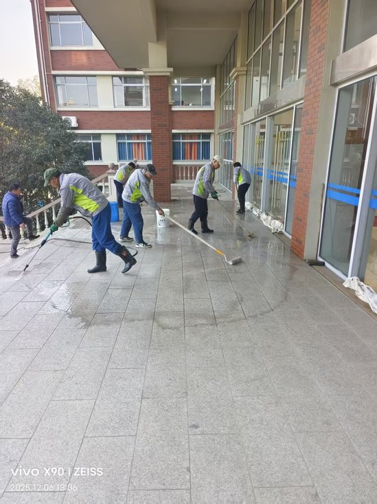 保洁团队对光华楼、日华楼等主要教学楼及康华楼进行深度清洁,并对教学楼周边公共区域开展系统性清扫,以崭新面貌迎接校庆。