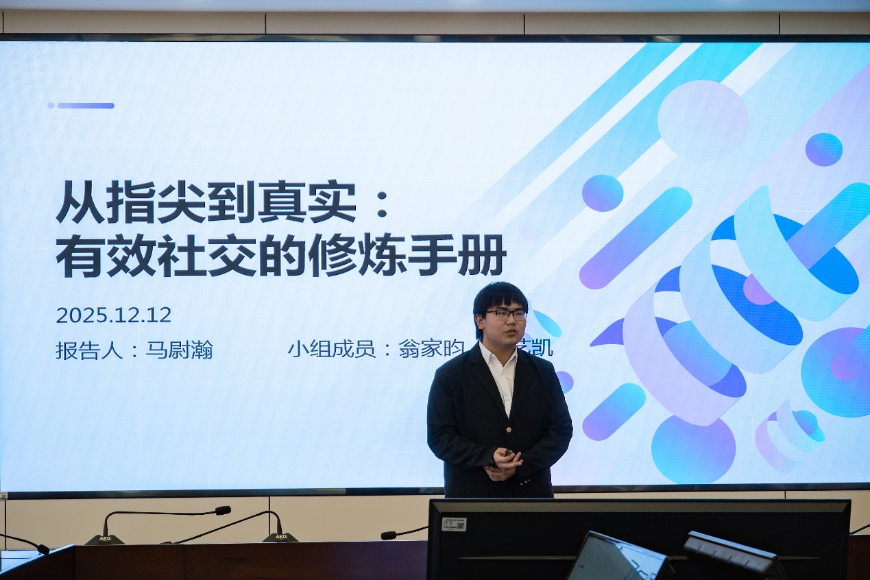二等奖作品之一《从指尖到真实:有效社交的修炼手册》来自人工智能学院马尉瀚团队。该作品关注大学生社交焦虑问题,设计了一套“线上破冰—线下实践”的社交赋能方案,通过AI辅助的渐进式社交任务引导,帮助学生在虚拟与现实之间建立健康、自信的社交关系。