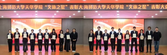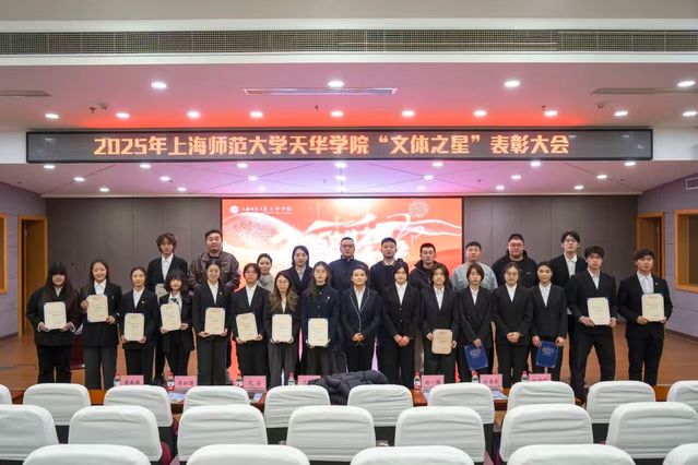 上海师范大学天华学院于2025年12月11日下午16:30在晖华楼报告厅举行2025年上海师范大学天华学院“文体之星”表彰大会。出席本次大会的嘉宾老师有校团委书记沈捷、校团委副书记邱晟吉、校团委副书记沈洁和大学生艺术团行政教师赵一腾以及各艺术团、各特色团队以及文体类社团指导老师们。大会由陆卓婷同学主持。