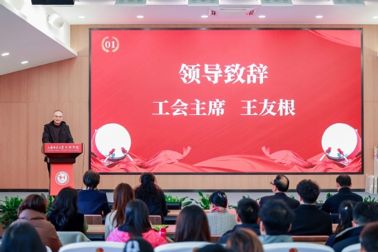 大会伊始,党委委员、工会主席王友根发表致辞。他代表学校工会向全体教职工致以诚挚的新年祝福,并全面回顾了2025年工会工作成效。过去一年,工会紧紧围绕学校高质量发展大局,践行“以职工为中心”的服务理念,在思想引领、服务职工、文体活动、民主建设等方面扎实推进、成效显著。这份成绩的取得,离不开学校党委的坚强领导、各部门的大力支持以及全体教职工的积极参与,尤其要感谢工会委员会委员和工会积极分子们的默默奉献。王友根表示,新的一年,工会将继续坚守服务初心,创新工作方法,拓展服务领域,加强组织建设,努力打造教职工信赖的“温暖之家”,为学校高质量发展注入更强动力。