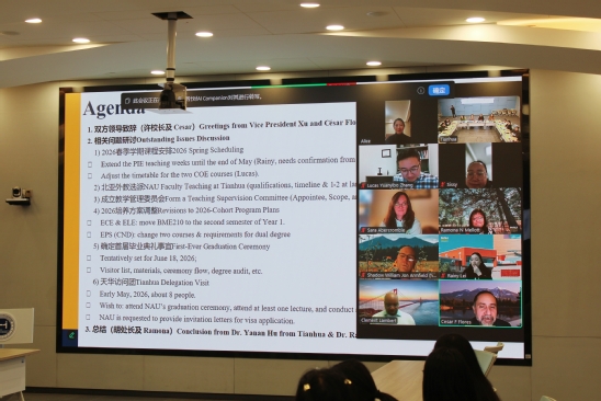 2026年1月9日上午,北亚利桑那学院联合管理委员会(扩大)会议在上海师范大学天华学院明华楼远程会议中心如期举行。会议线上线下融合,由北亚利桑那学院副院长梁杰与美国北亚利桑那大学负责该4+0项目的协调员张元艺伯(Lucas Zhang)联袂主持。会议出席人员包括中方代表上海师范大学天华学院副校长兼北亚利桑那学院院长许岳,北亚利桑那学院常务副院长兼天华学院国际交流处处长胡雅楠,教育学院院长徐娟、副院长杨悦,健康学院常务副院长刘敏、副院长孙连荣,专业主任井韵琦、柴豪頔、邵楚芸,协调员潘杰、陈笑等;外方代表北亚利桑那大学国际教育中心全球事务副教务长塞萨尔•F•弗洛雷斯•马克斯(César F. Flores Márquez),教育学院院长拉蒙娜·梅洛特(Ramona Mellott)、副院长肖多·威廉·乔恩·阿姆菲尔德(Shadow William Jon Armfield),系主任克莱门特·兰伯特(Clement Lambert),萨拉·安妮·阿伯克龙比(Sara Anne Abercrombie)以及全球合作项目经理雷小雨(Rainy Lei)等。会议聚焦“首届毕业”以及“外方师资选派”两大核心议题,务实磋商、凝聚共识,为项目高质量收官与可持续发展锚定新航标。