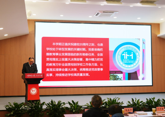 党政监总结发言阶段,党委书记高建华代表党委作工作总结。本学期党委持续夯实思想、组织、群众三大基础,深入学习贯彻党的二十届四中全会精神,围绕建校20周年策划系列宣传活动,东校区开园获10余家媒体报道;完成党总支换届,培育多个标杆院系和样板党支部;统战、工会、共青团工作协同推进,党建共建成果丰硕。在立德树人方面,深化师德师风、思政课程和协同育人建设,学校全年斩获8个党建思政类优秀组织奖,多项成果获全国及市级奖项。同时,党委完善人事管理制度,促进教师职业发展;优化学风建设举措,筑牢校园安全底线,为学校发展提供坚实保障。站在新的历史起点上,党委将进一步完善干部队伍培养考核、完善师资队伍激励机制、完善立德树人协同深度,奋力开创学校事业提质增效、再攀新高的崭新局面。