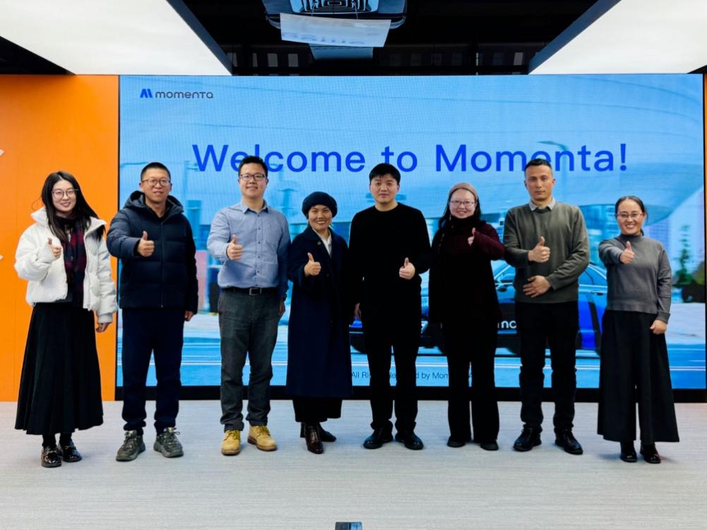 为精准对接人工智能与智能网联汽车行业发展需求,深化产教融合协同育人机制,1 月19日下午,上海师范大学天华学院校长助理、就业与生涯指导中心主任胡珍,人工智能学院常务副院长吕博,人工智能学院党总支书记赵科,就业与生涯指导中心副主任邱欣寅等一行6人赴苏州魔门塔(Momenta)总部开展调研交流。魔门塔安全与公共事务负责人王飞、总监丁佳俊、经理颜菲靓热情接待并参与座谈。