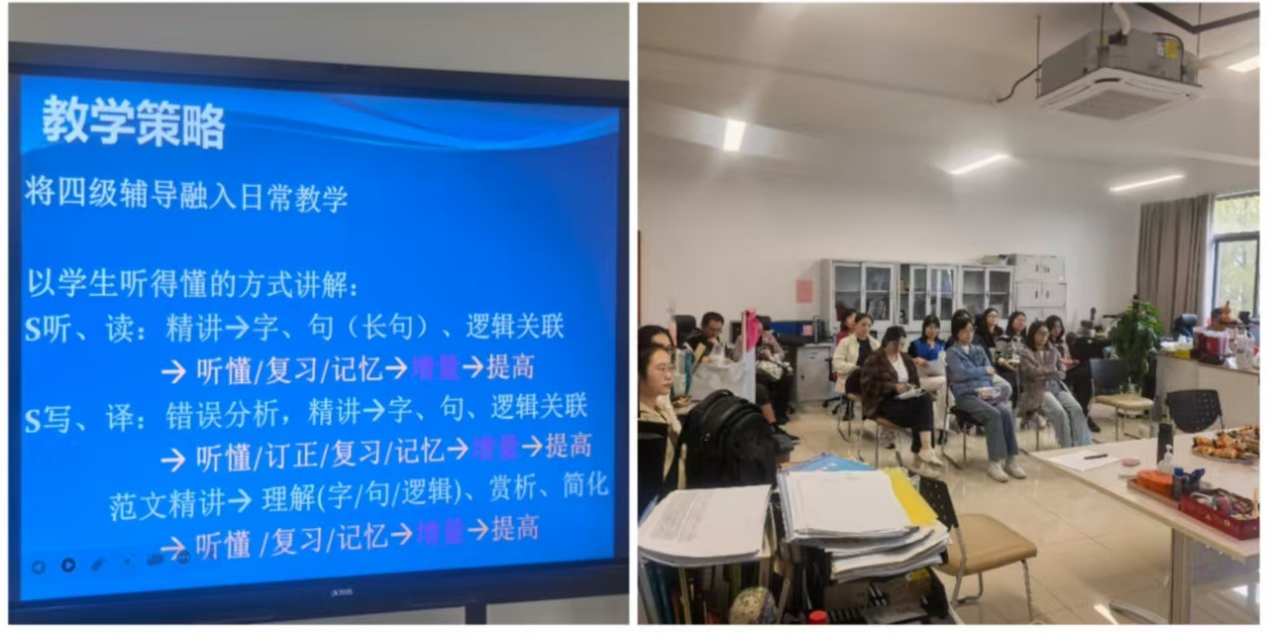 四、协同教研,资源共享。 定期组织教师集体备课,深耕四六级教学方法;建立优质教学资源库,促进经验共享与整体提升。