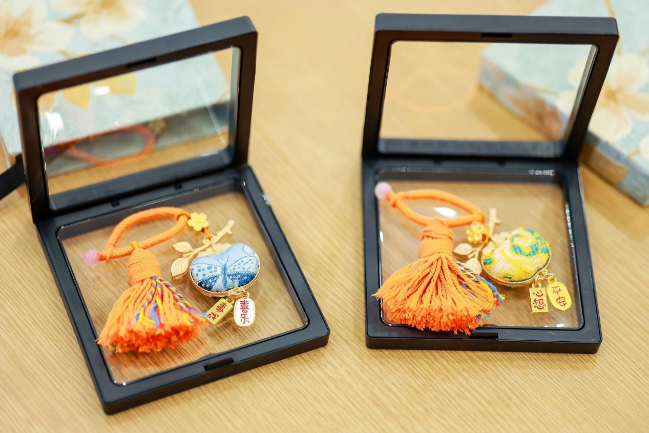 活动伊始,指导老师为大家讲解宋锦“锦绣之冠”的非遗文化底蕴、织造技艺与历史传承,让大家沉浸式感受传统工艺的独特魅力。在指导老师的带领下,大家亲手体验经纬交织的技艺,一步步将零散的锦片、配饰制成精巧别致的宋锦挂饰,一件件作品既凝聚着老师们的巧思与匠心,更让非遗文化在指尖传承、在校园绽放光彩。