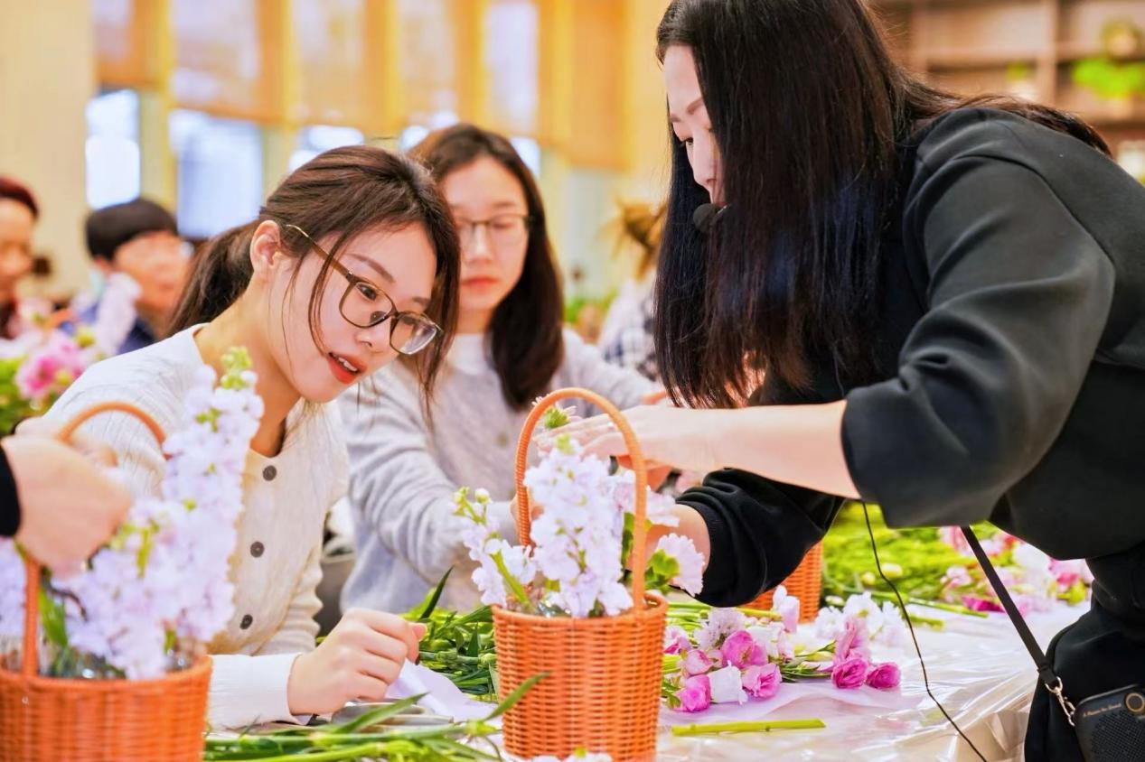 活动现场,专业花艺师细致讲解花材辨识、枝叶修剪、造型搭配等花艺技巧,女教职工们兴致盎然、动手实践,从错落的枝叶排布到花朵的层次点缀,一步步用心打造专属花篮。淡雅的风铃草、娇艳的康乃馨,搭配灵动的配叶,在大家的巧手中变成一件件独具匠心的花艺作品。制作间隙,大家围坐一起,品尝精致甜点与现磨咖啡,交流插花心得,在花香萦绕间畅谈生活与工作,享受着慢下来的美好时刻,尽显巾帼柔情与生活情趣。