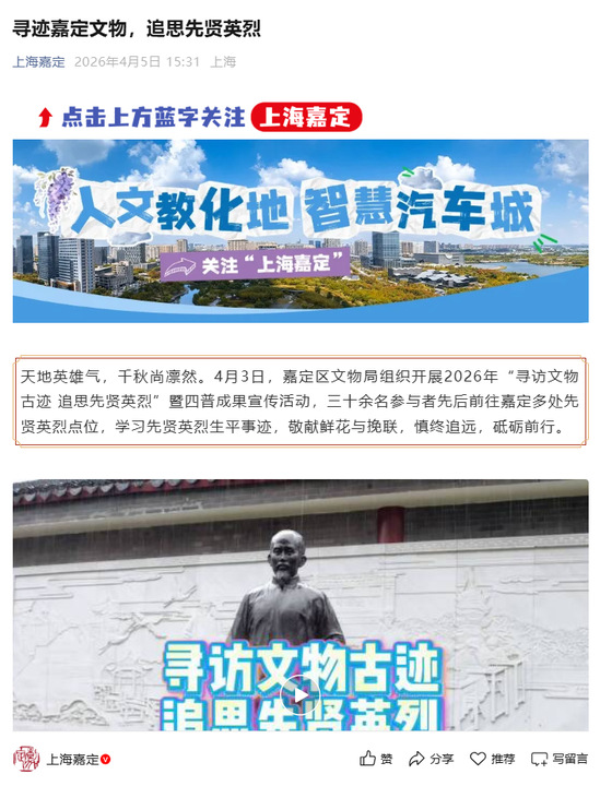 天地英雄气,千秋尚凛然。4月3日,嘉定区文物局组织开展2026年“寻访文物古迹 追思先贤英烈”暨四普成果宣传活动,三十余名参与者先后前往嘉定多处先贤英烈点位,学习先贤英烈生平事迹,敬献鲜花与挽联,慎终追远,砥砺前行。