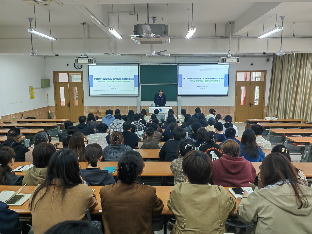高建华围绕教育强国建设、新质生产力发展、产教融合创新等核心内容展开系统讲解,强调高校必须坚守立德树人根本任务,摒弃重规模、轻质量、重排名、轻贡献的片面观念,将办学成效聚焦到育人质量、科技创新、社会服务、内涵发展上来,以正确政绩观引领学校高质量发展。