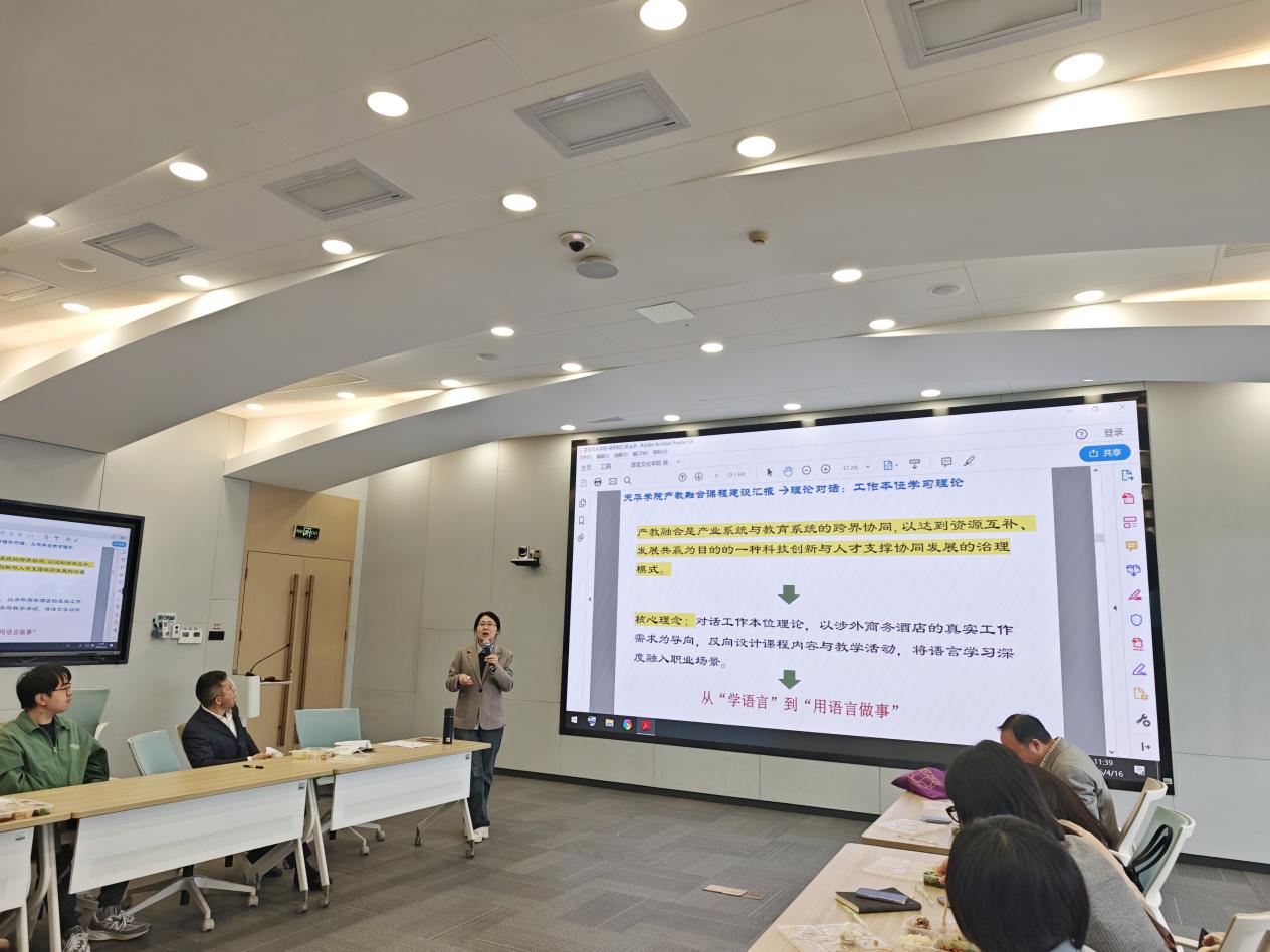 首先,侯彩虹博士做关于产教融合教学体系重构的分享。聚焦传统英语课程与时俱进主题,针对课程缺乏真实案例及学生实践能力较弱等问题,提出了重构方案。重构方案紧密围绕工作本位学习理论,强调将学习过程嵌入真实的工作情境中。在具体实践层面,团队联合上海东怡大酒店,组建了由校内教师与酒店高管构成的双师团队,将涉外酒店的真实服务需求转化为教学任务。教学过程重构了涵盖人文关怀、城市叙事及标准化服务等内容,并引入AI口语陪练和虚拟仿真场景来辅助学生练习 。此外,研究还利用天华智学平台构建了知识与能力图谱,实施校、企、生共同评价机制。通过这种供需对接与价值共创,项目旨在帮助学生完成从学习者向成熟社会人的平稳过渡。