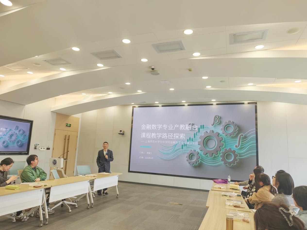 接下来,金融数学专业主任谢富生教授以“金融数学专业产教融合课程教学路径探索”为题做分享。谢教授结合专业建设实践,系统阐述了“数智赋能、产教共生”的核心理念,分享了构建“四业联动、四学贯通、四维一体”实践教学体系的经验。他详细介绍了与同花顺、德邦证券、汇添富基金等企业深度合作、共建课程与实训基地、开展量化投资与大数据分析教学、组织学科竞赛等具体举措,展示了学生在竞赛获奖、论文发表及高质量就业等方面取得的成效。报告内容翔实、案例生动,为各专业推进产教融合、提升应用型人才培养质量提供了有益借鉴。与会教师纷纷表示深受启发,将结合自身专业特点积极探索产教融合新路径,共同推动学校教学改革与内涵发展。