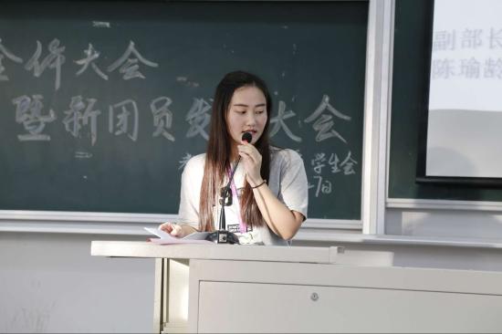 教育学院分团委第十届学生会文体委员张静闻代表三个委员进行发言,她以自身出发,用自己经历向新部员阐明了什么是学生会、进入学生会之后应秉持的正确态度以及向新部员们将面临的学生会工作提出了一些建议和看法。教育学院学生会主席曹汇钦的发言简明扼要,先是介绍了学生会组织架构,希望大家可以对学生会有进一步的认识;接着对本学期重点工作进行介绍,提出对学生会部员们的基本要求,希望新部员可以遵守各项要求,以身作则,树立起良好的干事形象,为同学们做出表率。