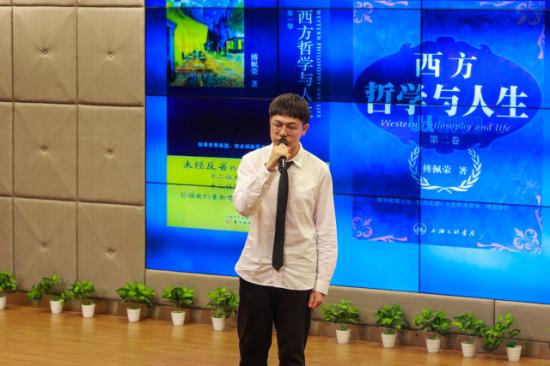 来自17数字媒体艺术1班的马之杰同学带来了演讲《哲学与人生》。他深沉有力的嗓音,仿佛一位智者般,带领着现场的同学们一同领略了《哲学与人生》这本书的精妙之处。结尾,马之杰同学还将一段书中句子以英文诵读的方式送给了在座观众们,充分展现了我院学子的风采。