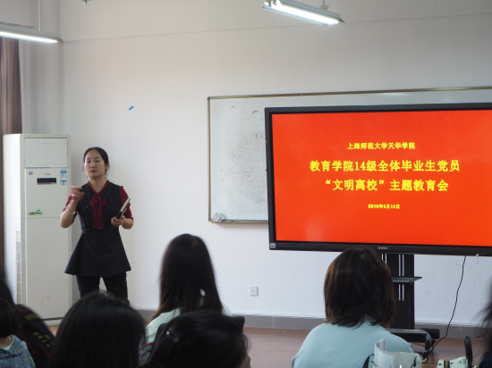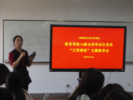 为积极响应《中共中央组织部关于做好高校毕业生党员组织关系管理工作的通知》和市委组织部的工作要求,进一步加强对毕业生党员的教育管理,增强毕业生党员的的党性修养,提高思想觉悟,2018年5月10日中午12:00,教育学院顺利开展毕业生党员文明离校教育会。参加会议的领导老师有教育学院党总支书记答英娟老师、教育学院党总支副书记朱可老师以及教育学院各专业支部书记与副书记。会议以“永葆共产党员先进性”为主题,由教育学院党总支副书记朱可老师主持。参加本次集中教育活动的同学为全体毕业生党员,共计61人。