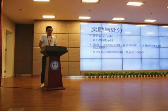 2017年9月19日10:20起,17届新生于晖华楼小礼堂集体学习《寻梦天华》学生读本,由管理学院新生辅导员分专业对学校学生管理规定进行深入解读,详细讲解了德育学分具体组成部分、学校奖励与处分具体实施条例、转专业所需相关条件和学校学位证书授予四个部分,助力同学们理解校规校纪,并现场举例对加权平均绩点的正确计算做出示范,帮助同学们理解。