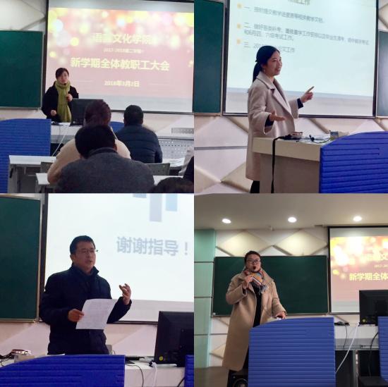 2018年3月2日下午,语言文化学院在明华楼演播中心召开了2017-2018学年第二学期初全体教职工大会。学院院长史文,常务副院长陈再阳,副院长胡雅楠,学院党总支书记、副院长孙超,副书记刘庆奇和杨央,各专业主任及全体教职工参加了会议。会议由孙超主持。