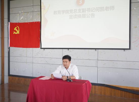 第三项议程是由教育学院党总支副书记何凯老师宣读换届公告。何老师主要对党支部委员会设置进行说明,列出六个支部委员会的初步设置,对各个支部委员会的设置进行详细阐述。