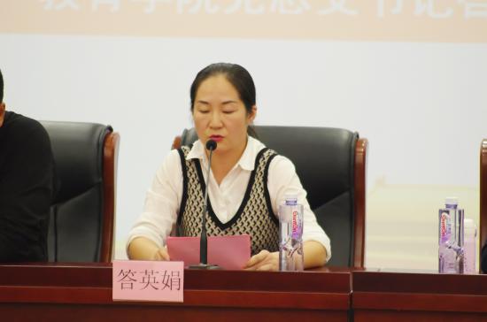 第九项议程是由教育学院党总支书记答英娟老师总结讲话。首先,答英娟老师就教育学院上一学年获得的众多成就以及教育学院的学生们与老师们的付出表示感谢。接着,答老师针对各项工作的开展情况提出三点要求:一、加强思想政治工作,落实好立德树人的根本任务。深入贯彻落实习近平主席所提出的“高校立身之本在于立德树人”这一精神,大力加强思想政治工作,紧密围绕五个“必须”:必须提高政治站位、必须履行好立德树人的职责、必须强化思想引领、必须紧密联系实际、必须坚持正面引导;二、练好“内功”,提高党总支的综合发展力。首先要加强队伍建设,完善工作体制,打造学院上下联动的良性机制,其次要优化政策环境和评价环境;三、强化责任落实。任命职责要具体,责任层次要分明,责任链条要紧密对接。最后,答英娟老师希望同学们能以优异成绩完成学院的工作任务,共同建设教育学院党总支更美好的明天。