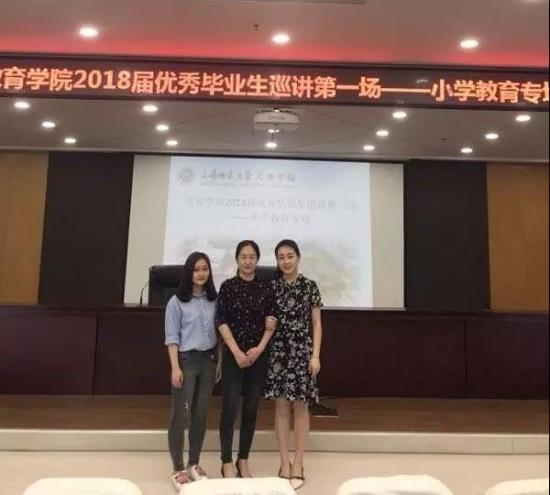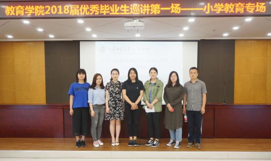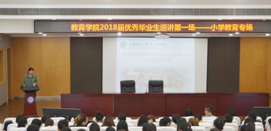 毕业弦歌响起,又一批的天华学子们,将在对离别的伤感与对未来的憧憬中告别母校。2018年5月18日中午11:30,教育学院2018届优秀毕业生巡讲第一场——小学教育专场在晖华楼报告厅顺利开展。此次巡讲由教育学院学前教育专业第二支部副书记姜婷婷老师主持,出席本次活动的有教育学院党总支书记答英娟老师、党总支副书记兼学前教育第一支部书记朱可老师、教育分团委书记沈洁老师、艺术教育第一支部书记贾孟云老师以及教育学院的正辅导员们,参加本次活动的为教育学院全体小学教育专业的同学们以及教育学院的党员、积极分子们。