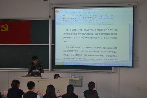 | 工学院于2014年5月5日下午在日阶402召开五月学风建设月动员大会。工学院党总支书记刘香连、副书记赵科和各班正副辅导员出席大会,工学院党员工作站全体成员和各班班委作为学生代表参加大会。 工学院学生会学习部部长周传建介绍了该院五月学风建设月活动期间的学风监察细则及学风主题系列活动安排,党员工作站策划部部长林杰提出“宿舍学习一小时”的学习读书倡议。最后,工学院党总支书记刘香连老师对学风建设月活动进行了简要说明,希望各班以本次学风建设月为契机,更好的规范自身行为规范,养成良好学习习惯,争创优良学风。 | ||