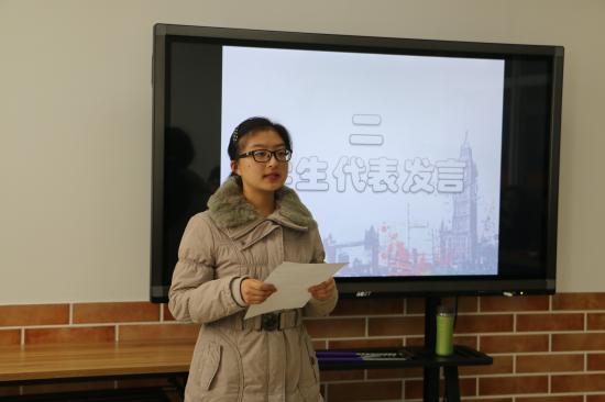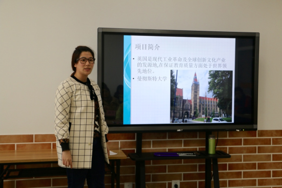 “读万卷书,行万里路”。在主持人陆韫简短的开场白中,总结会正式开始。首先以简短的视频回顾了研修团在英国学习生活的点滴。我院首批15名同学在杨央、梁杰两位带队老师的带领下,背起行囊,走出国门,远赴英国展开了一段意义非凡的研修旅程。随后,杨央向在场师生具体介绍了此项目的开展过程,阐述了活动的收获,让在场的同学对赴英研修活动有了更深的了解。2014级英语专业的顾宇琦用生动形象的例子分享了自己的所见所感,畅谈了自己对中英文化、教育制度等方面的感受。无论是带队老师的项目介绍还是学生代表的心得分享,无不反映出本次赴英研修活动带来的满满收获和成功。同学们在英国学习期间,认真听课,积极参与讨论,完成个人展示汇报、撰写英语报告,最终都通过了考核,并获得了由英国曼彻斯特大学颁发的研修结业证书。