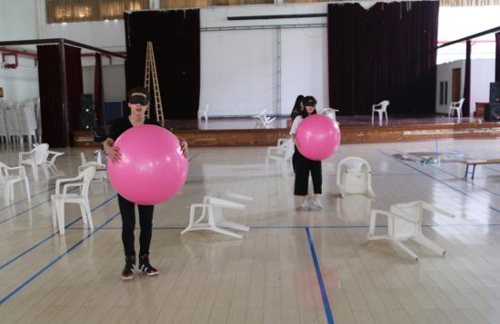 (选手们参加在体育馆内的瑜伽球碰撞比赛)