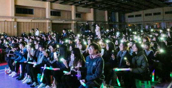 由辅导员老师沈蕾老师、贾孟云老师、杨婷老师和刘婧老师共同带来的歌曲《你的微笑》,音乐的热浪再次冲破晚会现场。同学们自发地站起来随着音乐的节奏挥舞着手中的荧光棒,将欢快的旋律与深情的演唱相结合,彰显了可爱与温馨,年轻与活力。