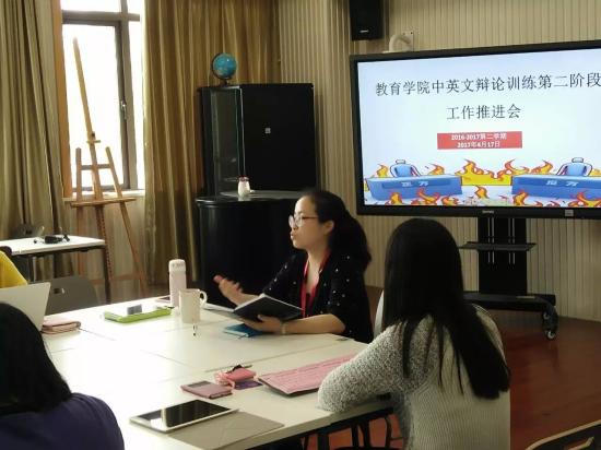 4月17日下午14点30分,教育学院中英文辩论训练第二阶段工作推进会在在光华楼204教室举行。此次会议由教育学院党总支书记沈晓燕老师组织召开并主持,教育学院全体正副辅导员老师参加,并特邀教育学院院长助理、小学教育专业主任韩苏曼老师参加。